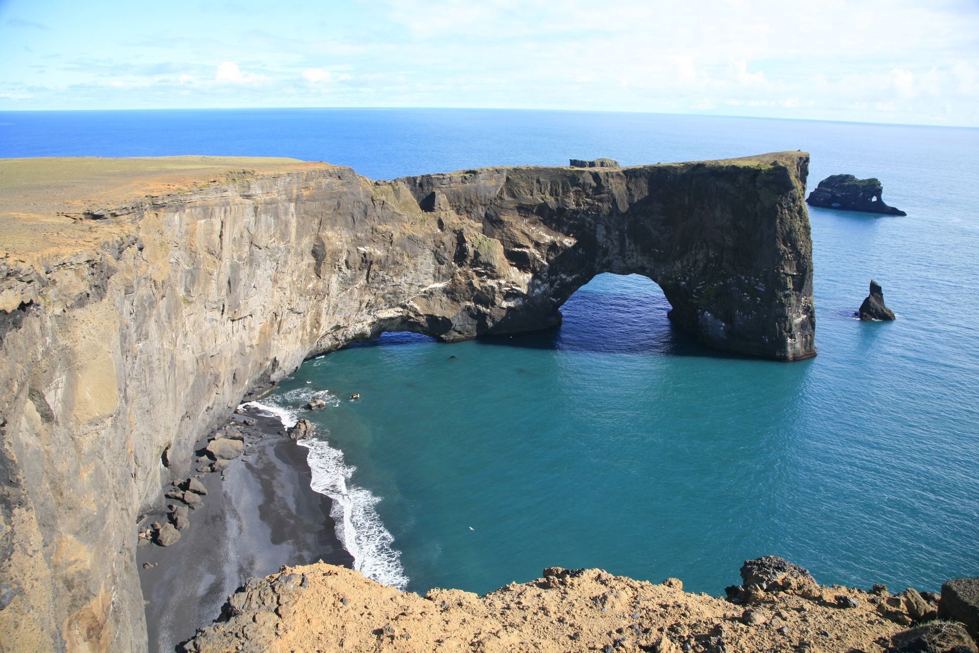 Day 3 - South Coast. Start the day by feeling the mist of the waterfall Skógarfoss before you visit the dramatic cliffs and sand beaches Dyrhólaey and Reynisfjara. Drive to Fjarðrárgljúfur, a fairytale-like gorge carved by glacial waters. Enjoy the peaceful village of Krikjubæjarklaustur, with a monastic history.